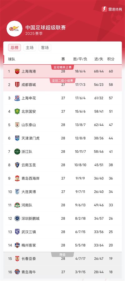 Haigang đã chấm dứt chuỗi 4 trận không thắng trong giải đấu. Trên BXH mới nhất, đội vẫn đứng đầu danh sách nhưng chỉ hơn Thành Đô 2 điểm. Nếu Chengda đánh bại Qingdao West Coast tối nay, nó sẽ vươn lên dẫn đầu. Shenhua sẽ chạm trán Dalian Yingbo vào tối nay, đội đang tạm xếp thứ 3 với 57 điểm.
