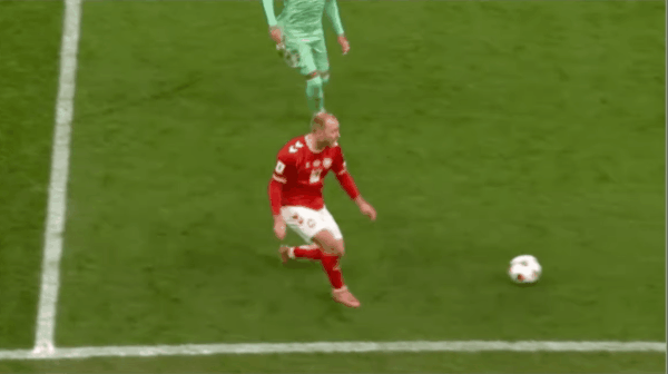 59' Hoibel vượt qua vòng cấm, Westergaard lắc đầu trong vòng ba giây nhỏ và sút cao khung thành