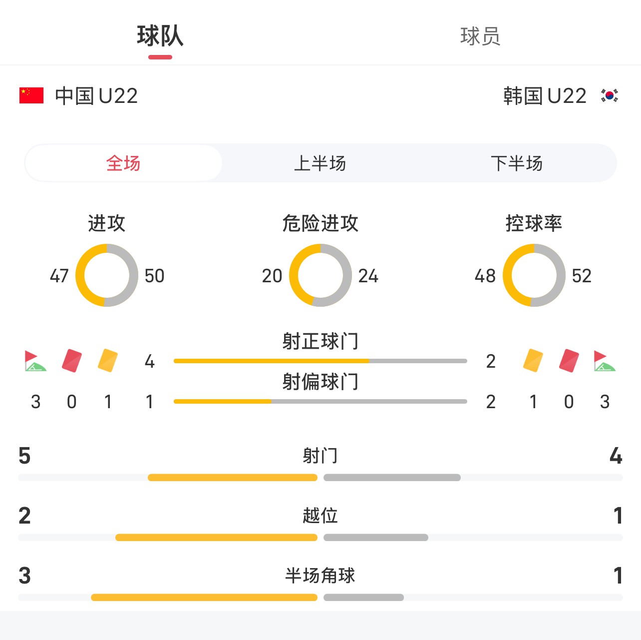 Thống kê toàn trận U22 Trung Quốc vs U22 Hàn Quốc: