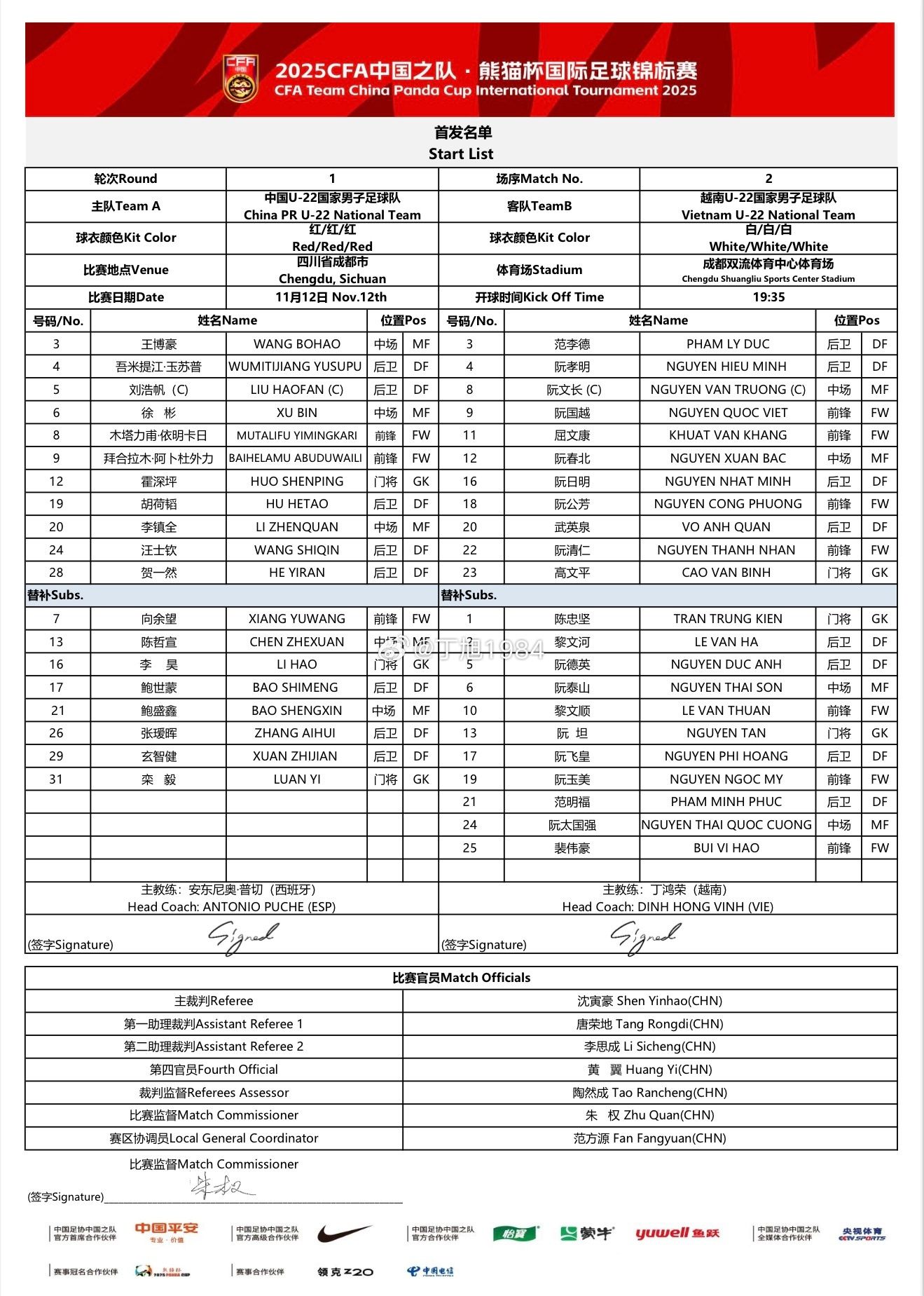 Lúc 19h35 tối 12/11, giờ Bắc Kinh, tại Giải bóng đá quốc tế Panda Cup 2025, đội tuyển bóng đá nam U22 Trung Quốc thi đấu với U22 Việt Nam trên sân Trung tâm Thể thao Thành Đô Shuangliu. Trước trận đấu, hai bên đã thông báo rằng Wang Bohao, cầu thủ trẻ hiện đang chơi cho đội Eredivisie League Dengbosch sẽ thi đấu.