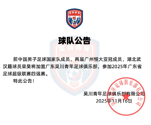 Chính thức: Dung Hạo gia nhập đội trẻ Wuchuan Quảng Đông và vào bán kết Giải bóng đá siêu hạng Quảng Đông