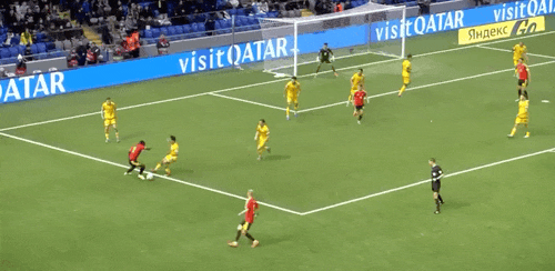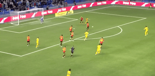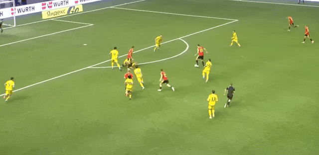 5' Trossard thực hiện cú đá cố định, Samorodov phá bóng, bóng suýt rơi vào khung thành của mình