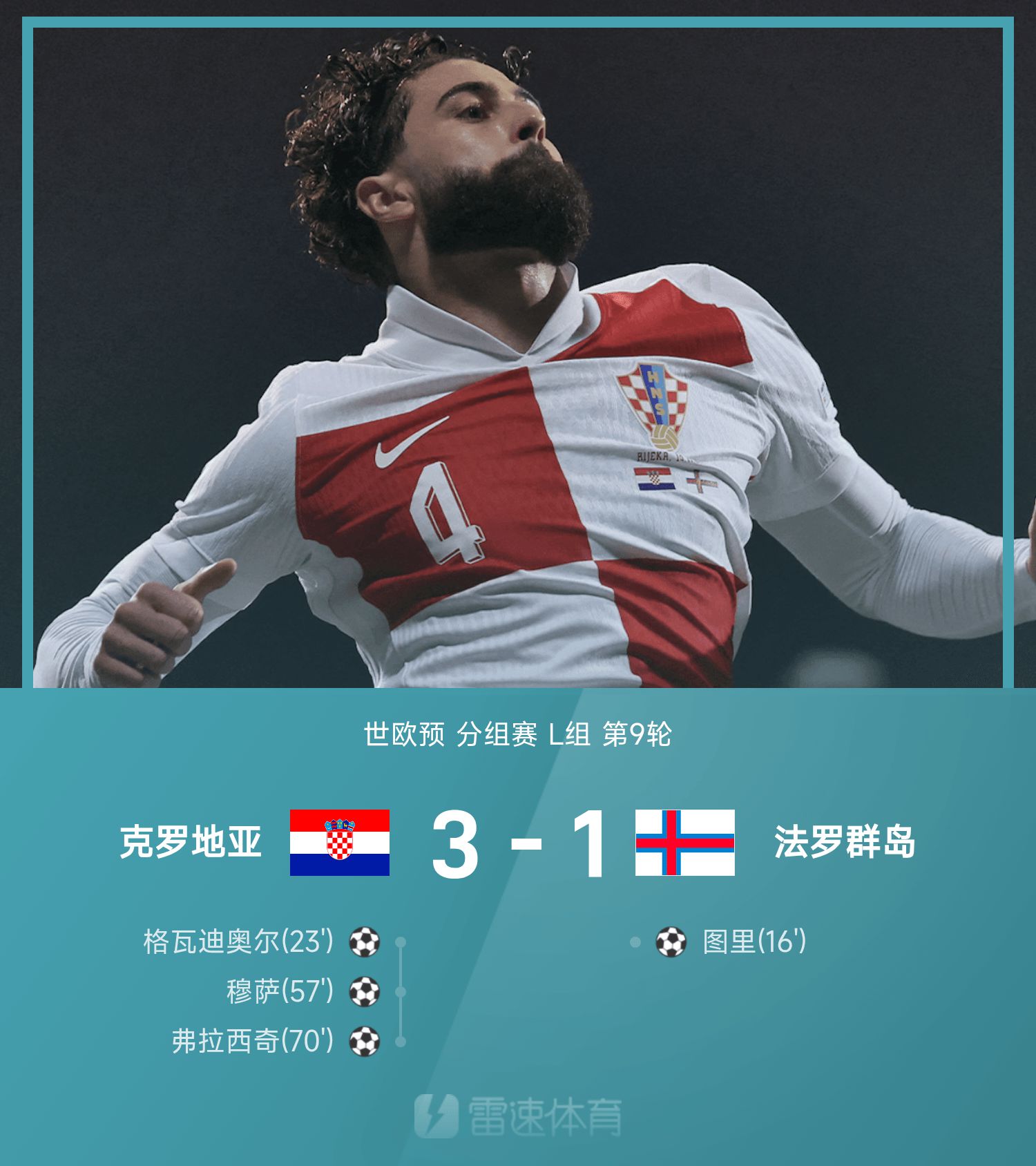 6686 Bản tin thể thao ngày 15/11 Ở lượt trận thứ 9 bảng L Vòng loại khu vực châu Âu thế giới lần thứ 26, Croatia đã đánh bại Quần đảo Faroe với tỷ số 3-1. Xuyên suốt trận đấu, Turi ghi bàn từ một pha dứt điểm chệch hướng giúp đội khách Quần đảo Faroe vượt lên dẫn trước. Sau đó, Gvadiol, Moussa và Vlasic liên tiếp ghi bàn hoàn tất màn lội ngược dòng. Modric được thay ra ở phút 61, và Croatia tiến tới World Cup.