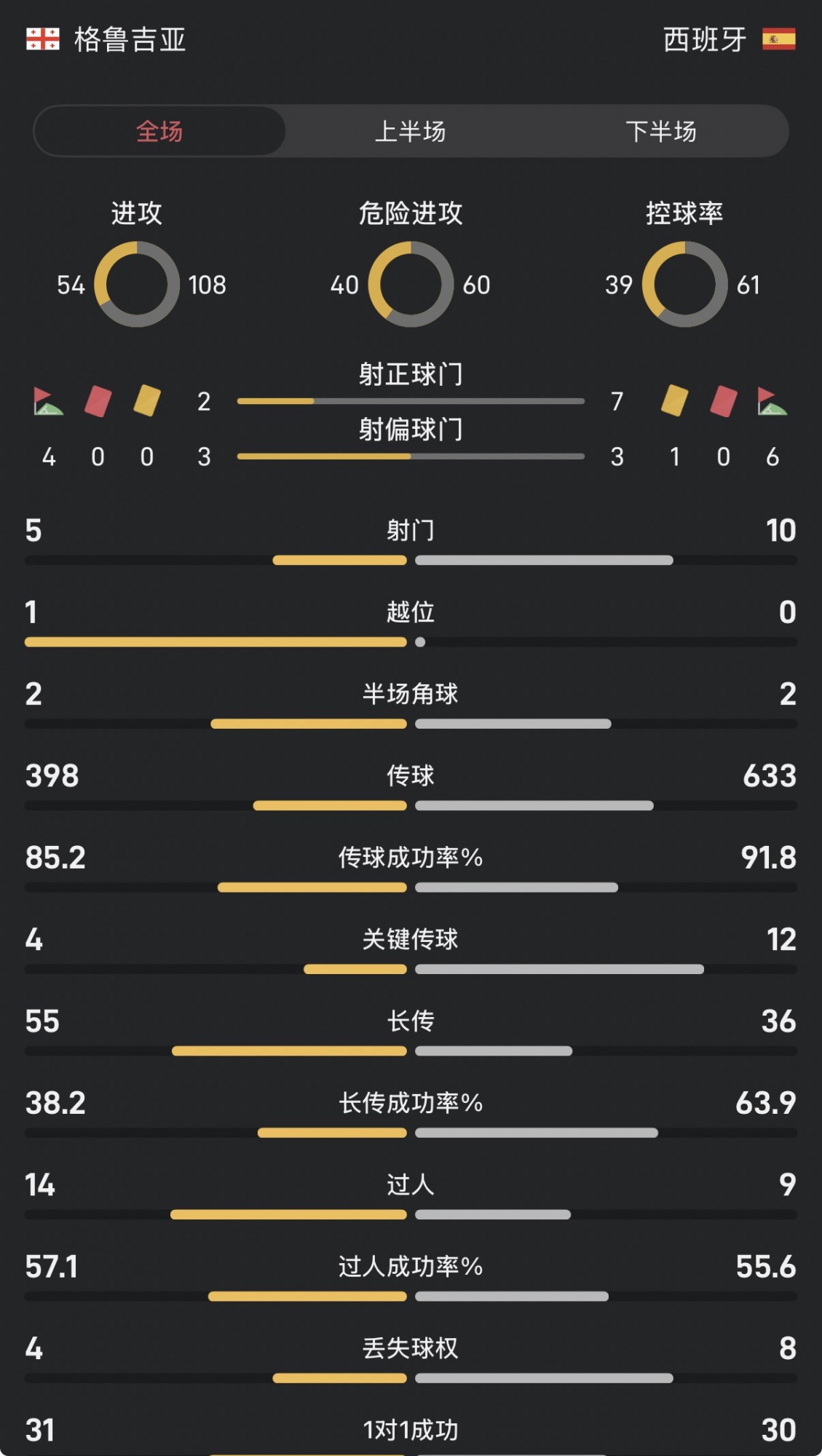 Thống kê toàn trận Georgia vs Tây Ban Nha