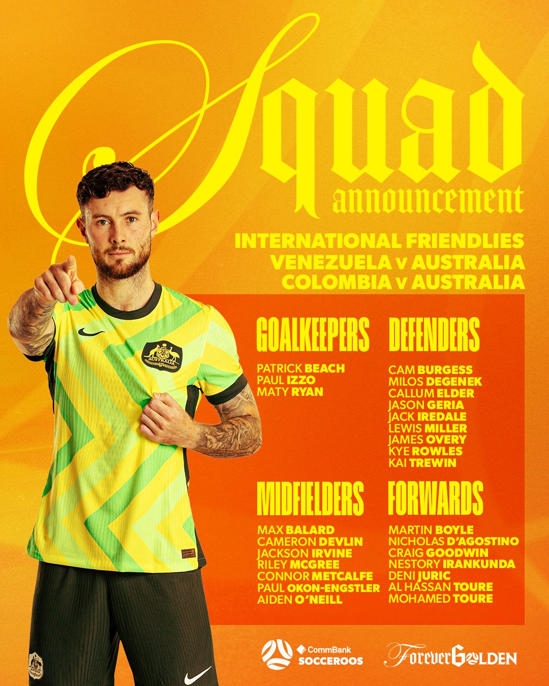 6686 Sports đưa tin ngày 7 tháng 11 rằng đội tuyển quốc gia Úc đã công bố đội hình mới. Đội sẽ đối đầu với Venezuela và Colombia vào tháng 11. Danh sách bao gồm Goodwin, Boyle, Irving và những cầu thủ nổi tiếng khác.