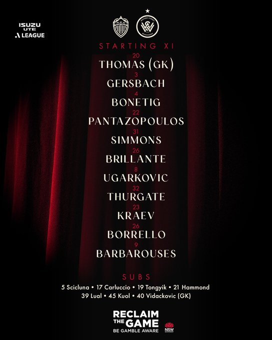 Đội hình xuất phát của Western Sydney Wanderers: 20-Thomas, 3-Gersbach, 4-Bonettigue, 31-Simmons, 22-Pantazopoulos, 25-Brillant, 8-Ugarkovic, 23-Klaye Chồng, 32-Serget, 9-Barbaroses, 26-Borello