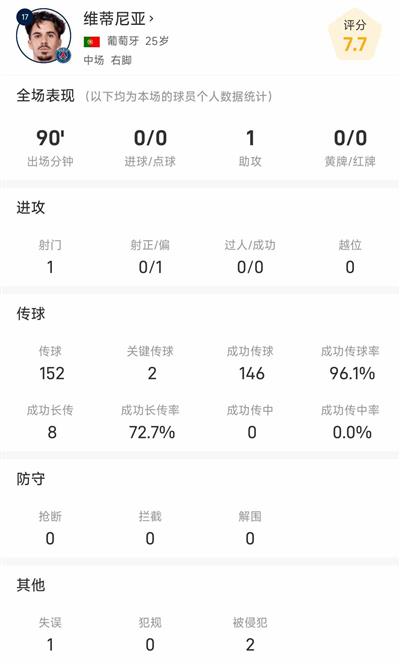 Thống kê cho thấy Vitinha chạm bóng tới 161 lần trong trận này, chuyền và nhận bóng tới 152 lần, chỉ mắc 6 lỗi, tỷ lệ chuyền và nhận bóng chính xác lên tới 96%.