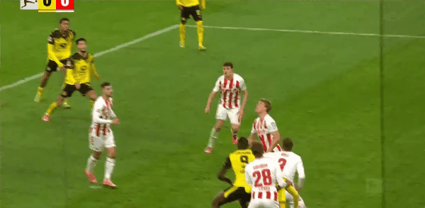 10' Pha bóng ở tuyến trên của Dortmund gây hỗn loạn, Anton đẩy góc xa từ cự ly gần và bị cản phá ở vạch cuối sân