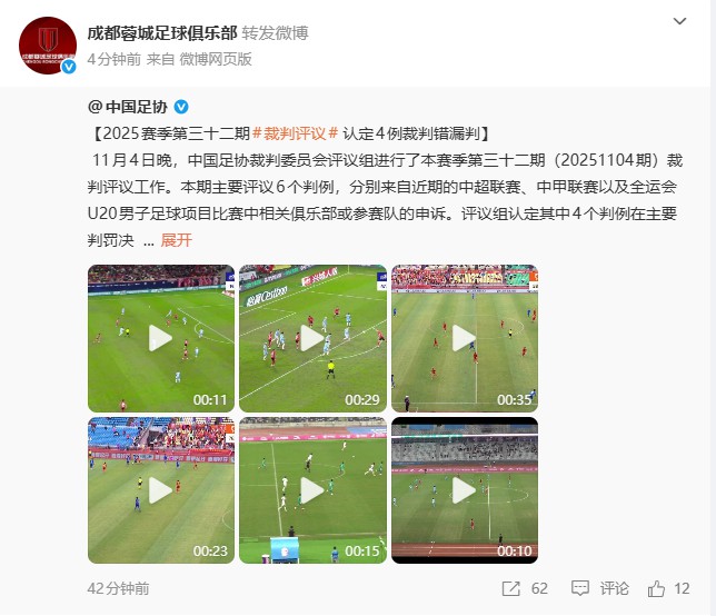 Sau đó, weibo chính thức của Thành Đô Thành Đô đã chuyển tiếp bình luận này do Hiệp hội bóng đá Trung Quốc đưa ra.