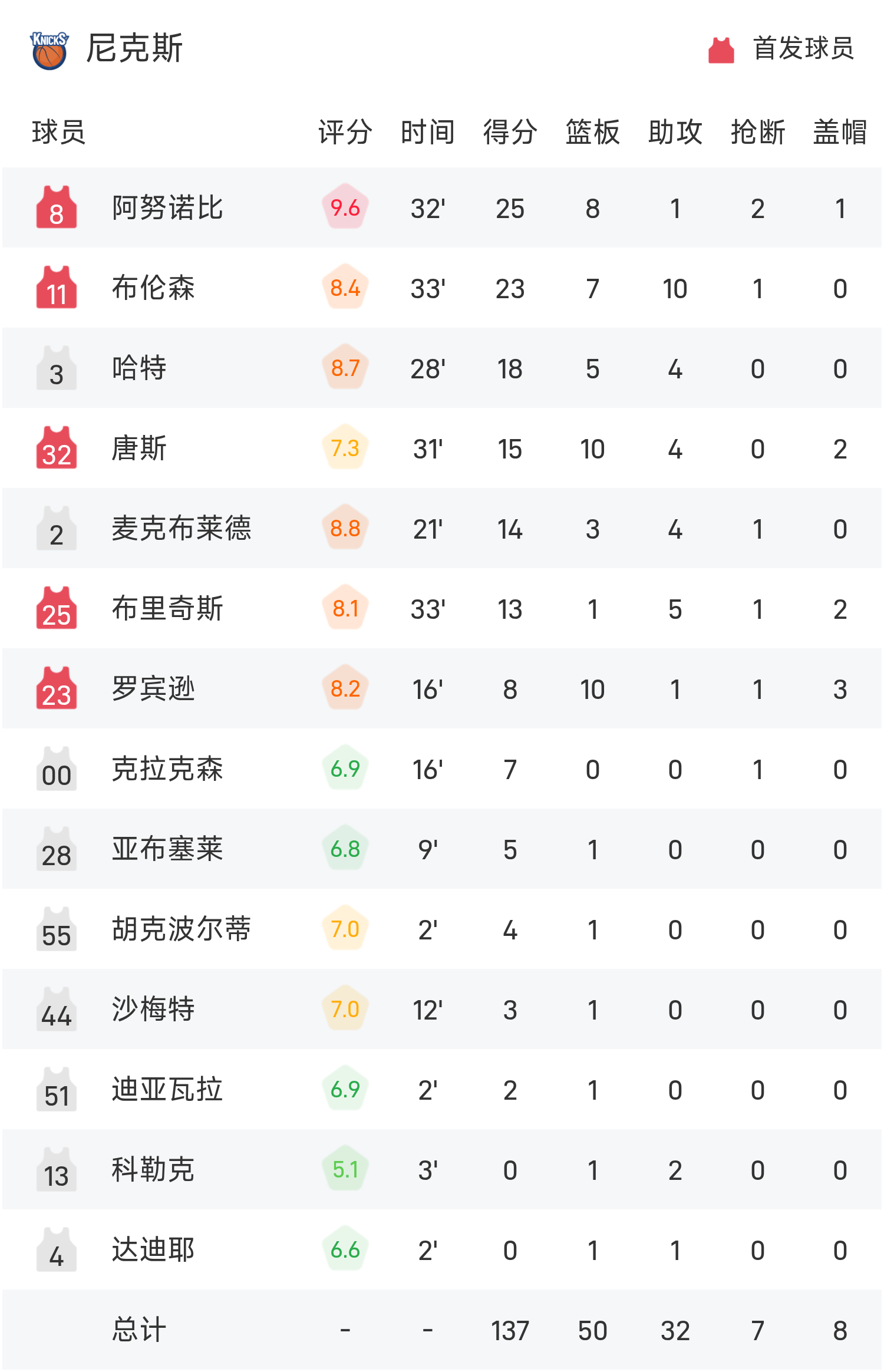 Anunoby ghi được 25 điểm và 8 rebound, dẫn dắt đội giành chiến thắng với 23 điểm, 7 rebound và 10 kiến tạo. Randall đã ghi được 32 điểm cao nhất trận đấu, 5 rebound và 4 kiến tạo.