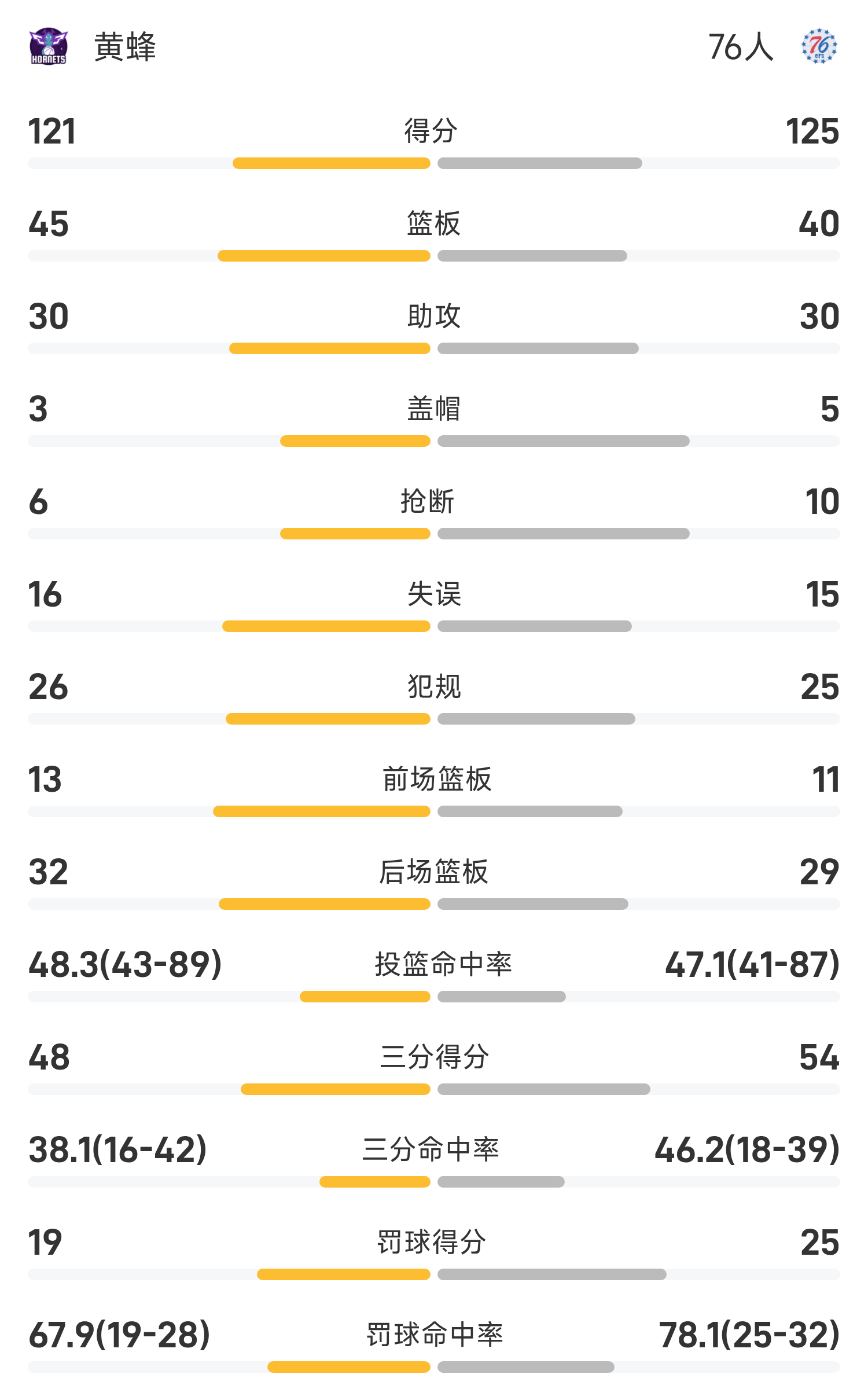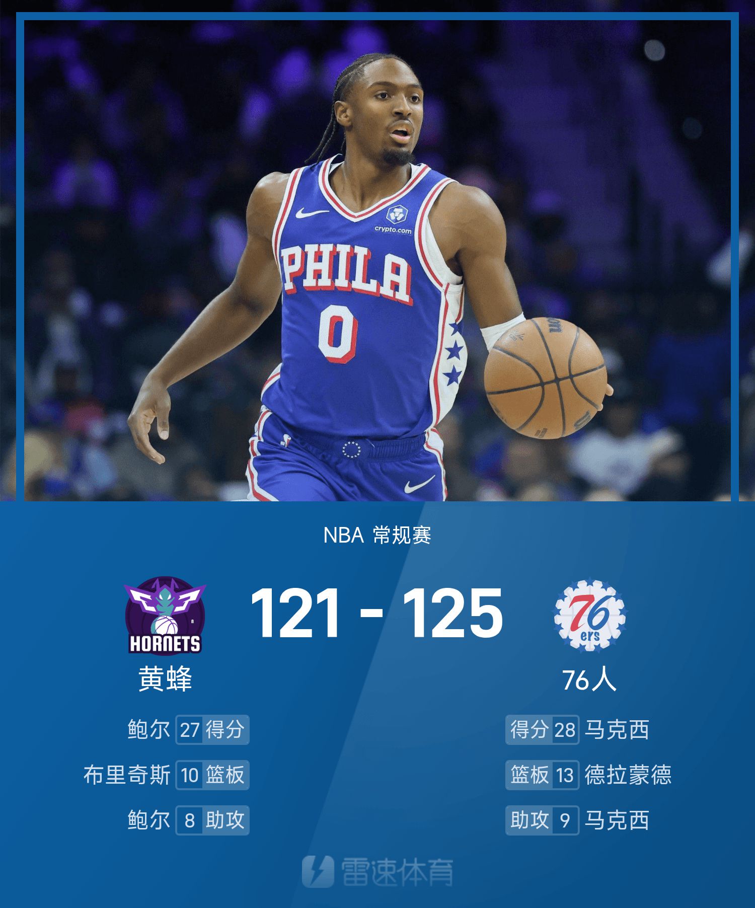 Cuối trận, 76ers đã đánh bại Hornets với tỷ số 125-121.