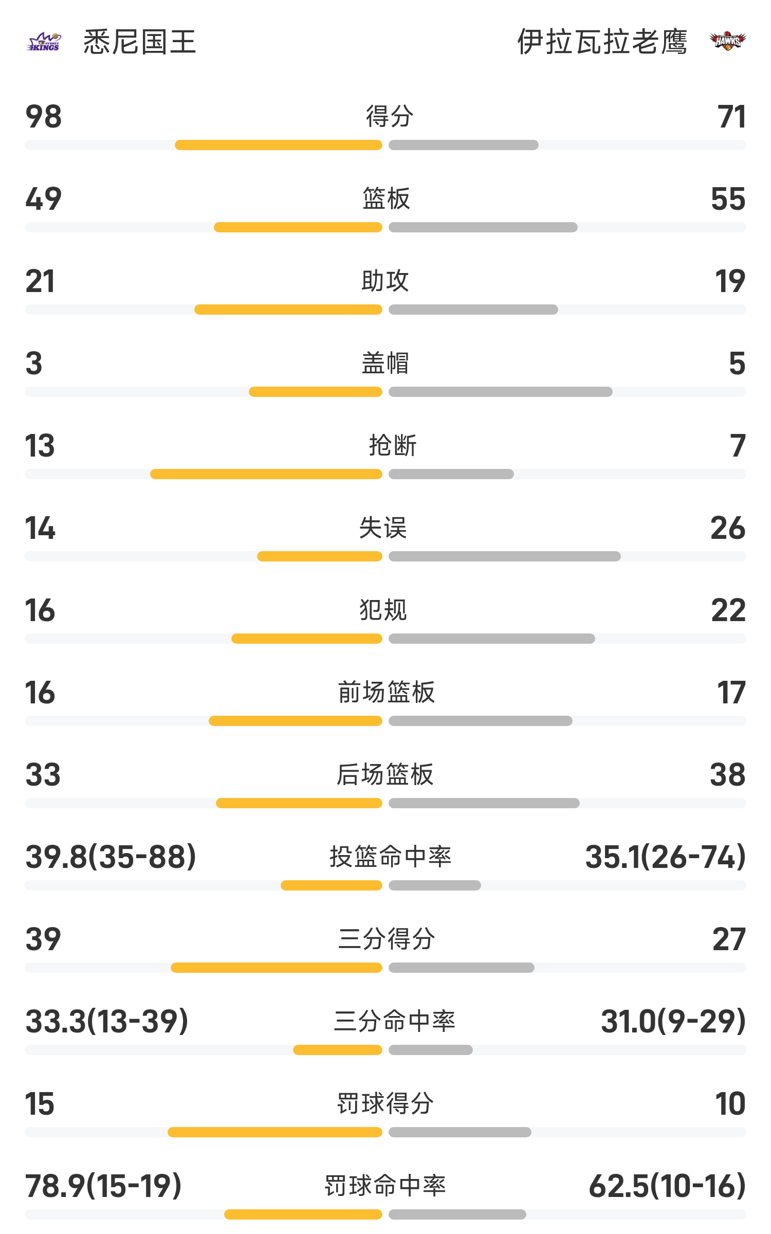 Cuối trận, Illawarra Eagles thua Sydney Kings với tỷ số 71-98.