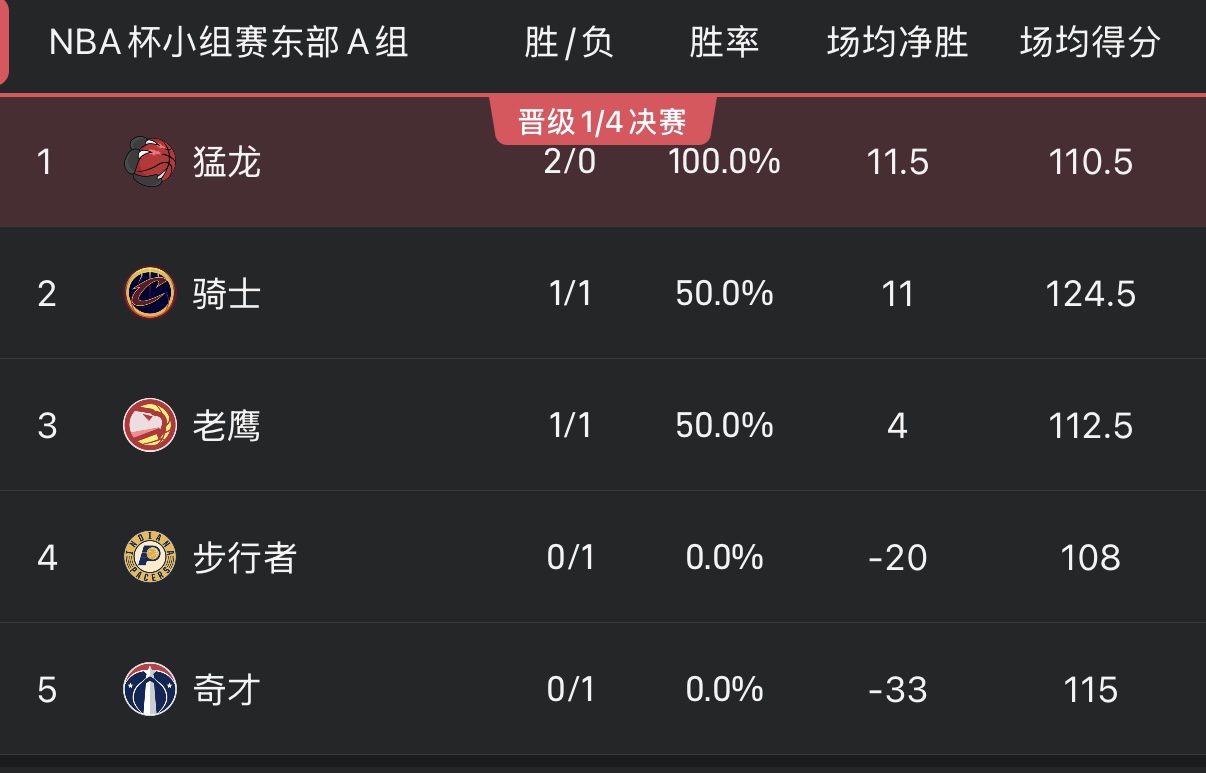 Ở bảng A miền Đông, Raptors đứng đầu danh sách với 2 trận thắng và 0 trận thua. Quan trọng hơn, họ đã đánh bại Cavaliers và Hawks, hai đối thủ cạnh tranh trực tiếp trong bảng ngay trận đầu tiên và hiện đang có lợi thế vượt qua vòng loại.