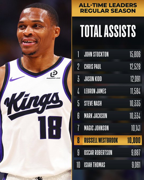 Hiện tại, cầu thủ Westbrook của Kings đã đạt 10.000 đường kiến tạo trong sự nghiệp. Anh là cầu thủ thứ 8 trong lịch sử NBA đạt được thống kê này.