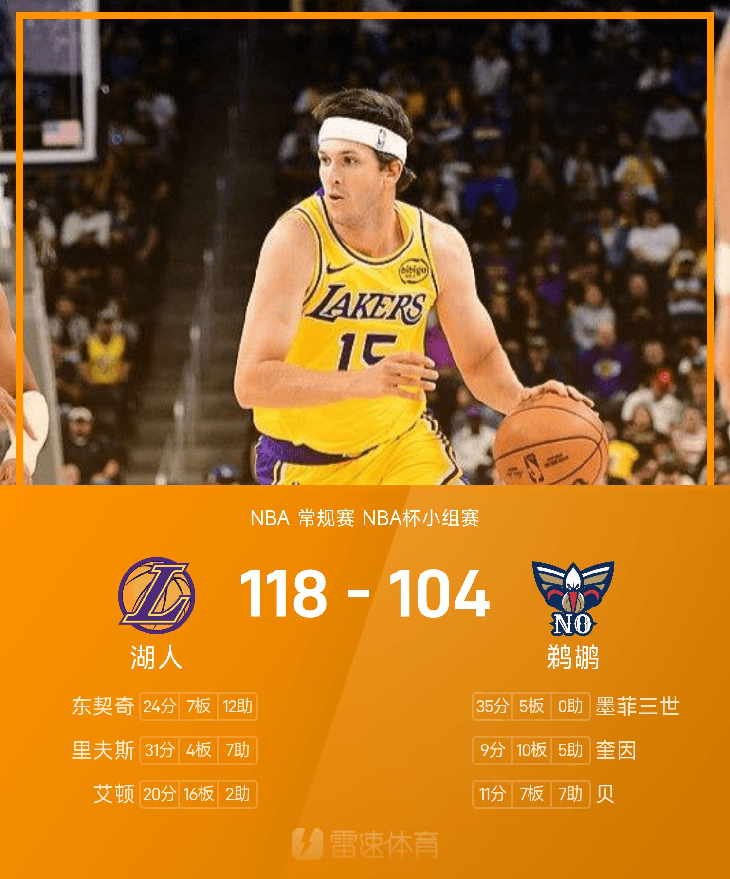 Báo cáo NBA Cup: Reeves 31 điểm và 7 kiến tạo, Lakers đánh bại Pelicans 118-104