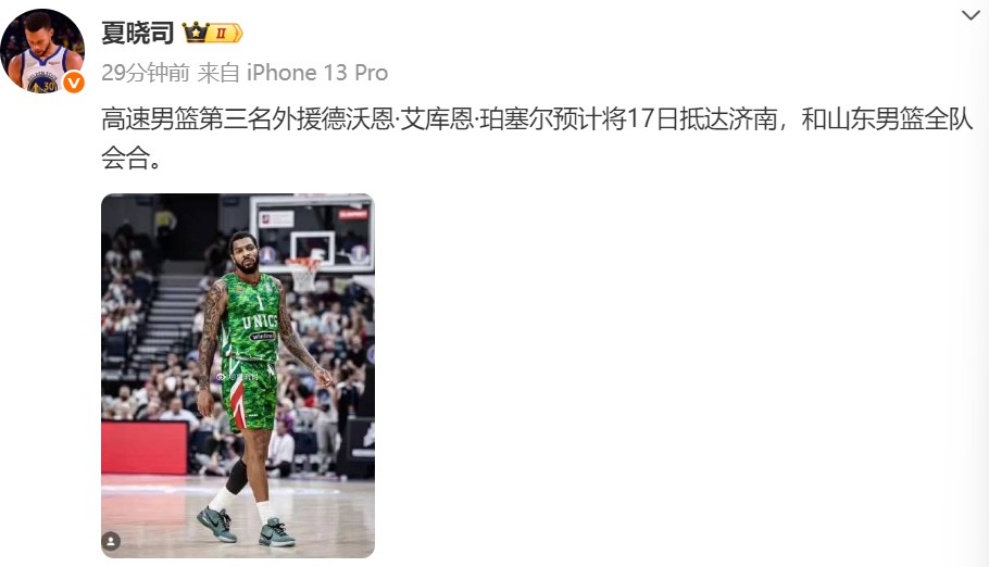 Văn bản gốc từ mạng xã hội: "Viện trợ nước ngoài thứ ba của Đội bóng rổ nam Sơn Đông, Devon Aikun Purcell, dự kiến sẽ đến Tế Nam vào ngày 17 và gia nhập Đội bóng rổ nam Sơn Đông."