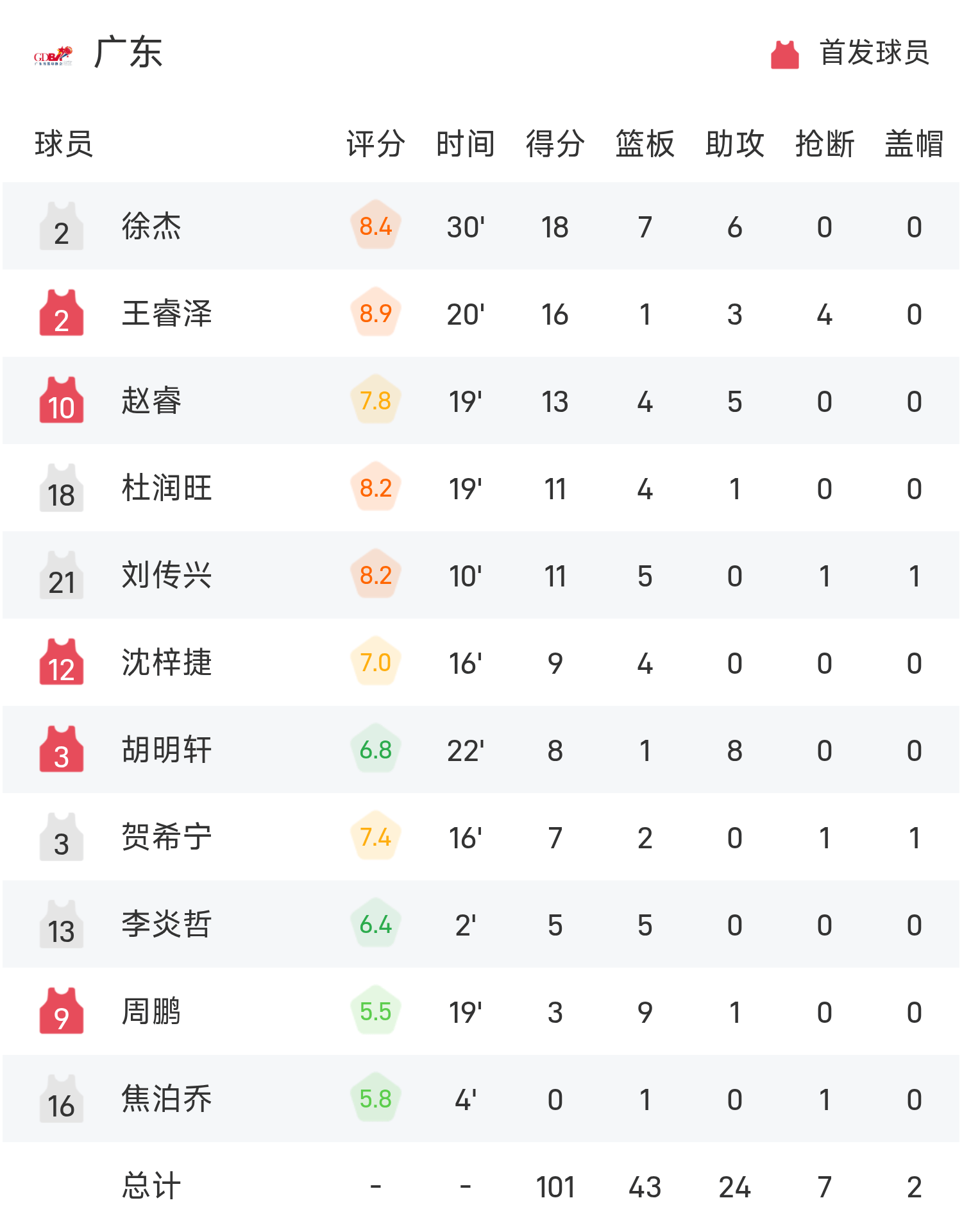 Xu Jie ghi được 18 điểm cao nhất trận, 7 rebound và 6 kiến tạo, trong khi Zhao Rui ghi 13 điểm, 4 rebound và 5 kiến tạo, đưa Quảng Đông giành chiến thắng và giành huy chương vàng bóng rổ nam tại Đại hội thể thao toàn quốc này.