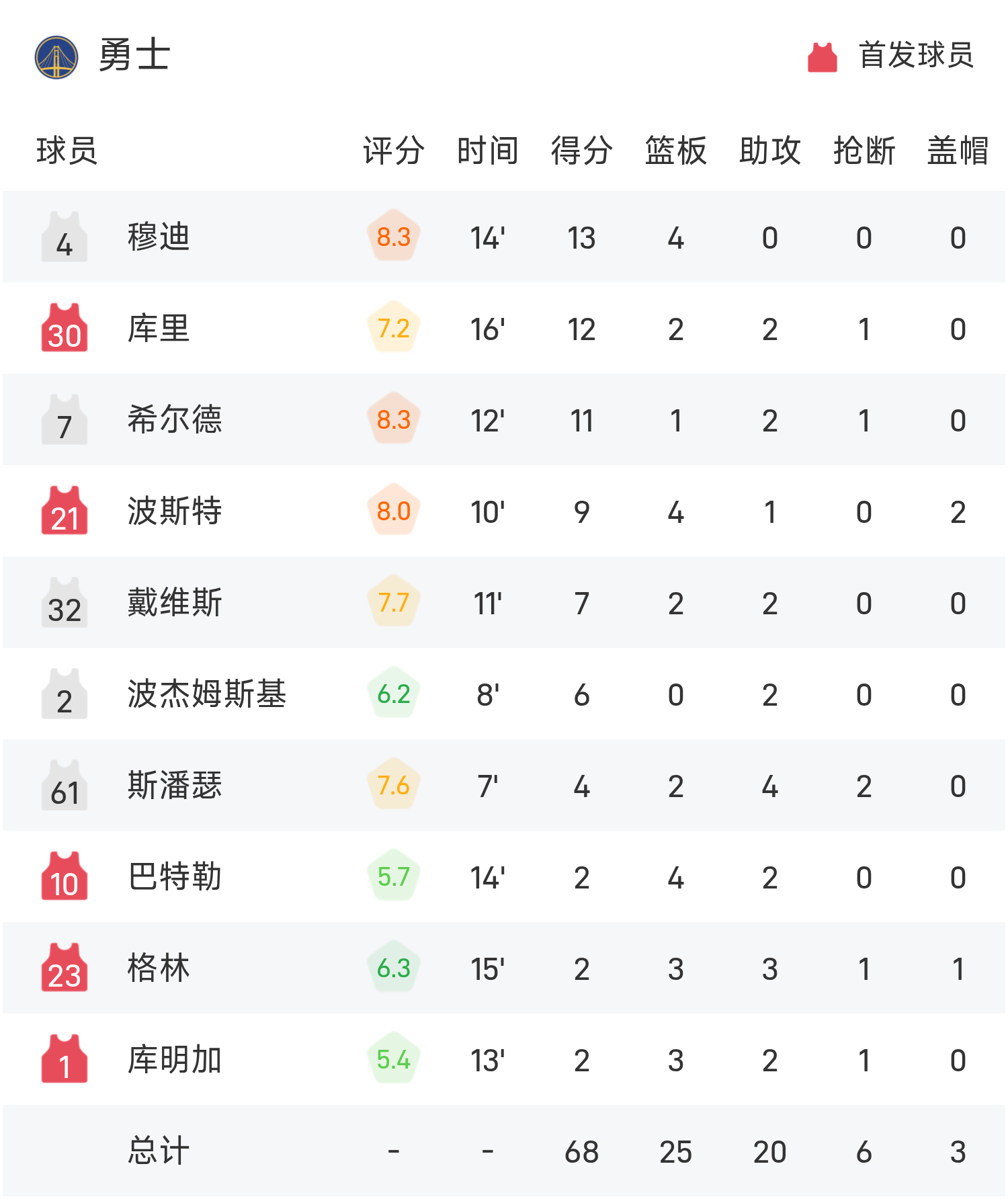 Hiệp một giải NBA: Moody ghi được 13 điểm, Warriors ghi được 10 điểm và Warriors dẫn trước Suns với tỷ số 68-49.