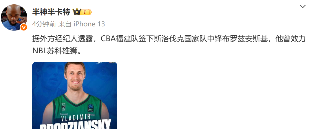 6686 Tin tức thể thao ngày 5 tháng 11 Theo đưa tin của người truyền thông trong nước "Demigod Half Carter", theo các đại lý nước ngoài, đội CBA Phúc Kiến đã ký hợp đồng với đội tuyển quốc gia Slovakia số 5 Brozianski, người từng chơi cho NBL Suko Lions.