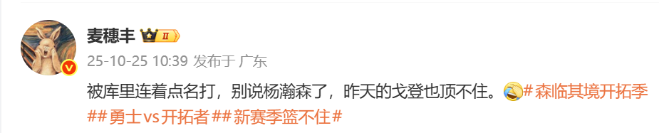 Người truyền thông @Mai Suifeng viết: "Bị Curry đánh thẳng tên chứ đừng nói đến Yang Hansen, hôm qua Gordon đã chịu không nổi."