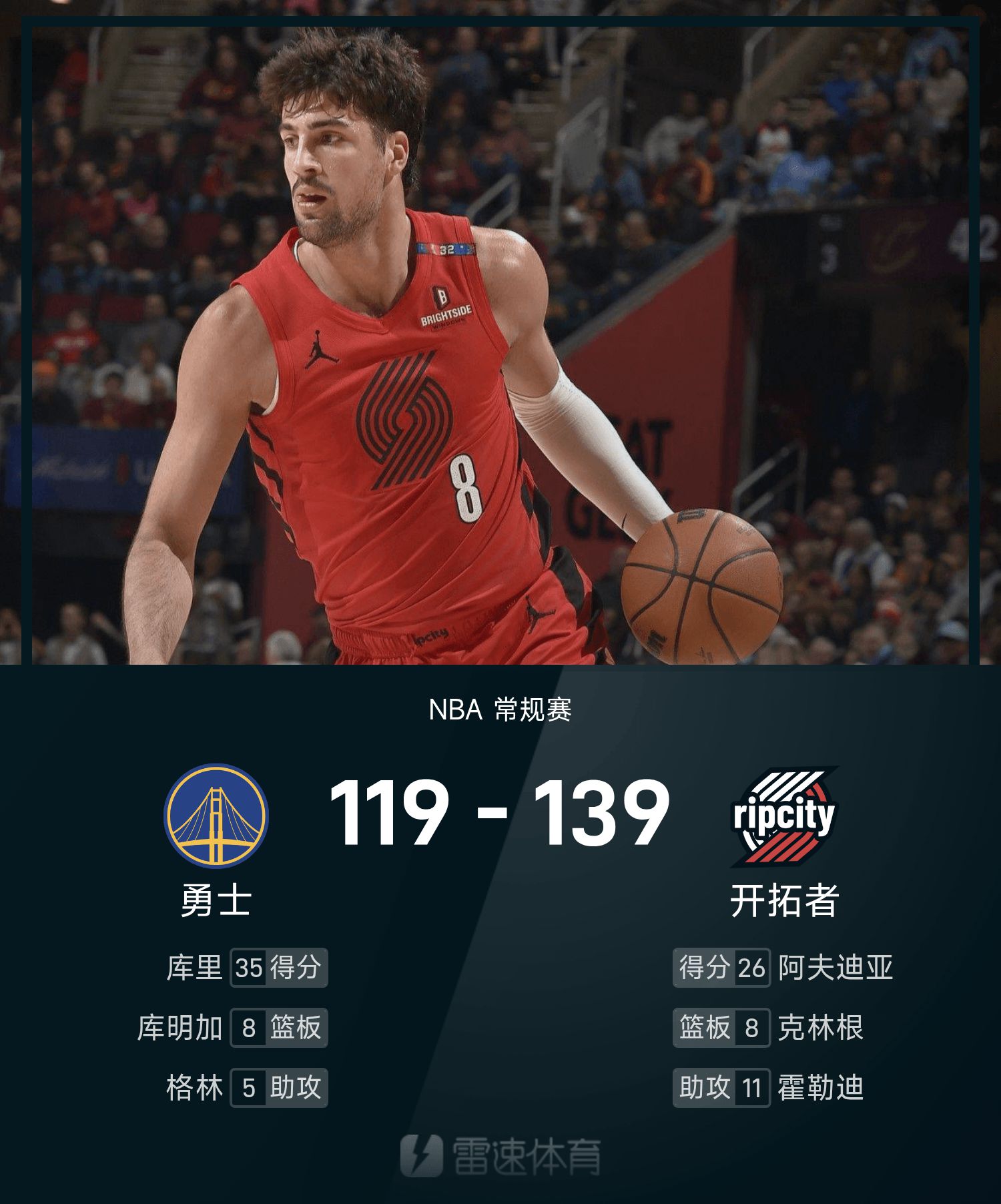 6686 Thể thao Tin tức ngày 25 tháng 10 Trong mùa giải NBA thường lệ 25/26, Trail Blazers đối mặt với Warriors. Kết thúc trận đấu, Trail Blazers đánh bại Warriors với tỷ số 139-119. Avdija ghi 26 điểm, 5 rebound và 6 kiến tạo để dẫn dắt đội đến chiến thắng. Curry ghi được 35 điểm cao nhất trận, 6 rebound và 3 kiến tạo.