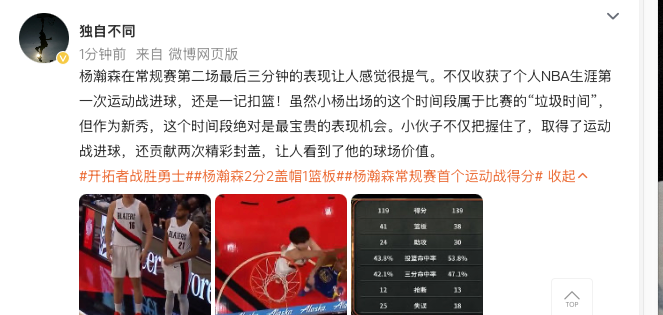Màn trình diễn của Yang Hansen trong ba phút cuối trận thứ hai của mùa giải là rất đáng khích lệ. Anh ấy không chỉ ghi bàn thắng trong trận đấu thể thao đầu tiên trong sự nghiệp NBA của mình mà còn là một cú hích! Mặc dù khoảng thời gian Tiểu Dương xuất hiện là “thời gian rác rưởi” của cuộc thi, nhưng với tư cách là một tuyển thủ mới, khoảng thời gian này chắc chắn là cơ hội biểu diễn quý giá nhất. Chàng trai trẻ không chỉ nắm bắt và ghi bàn thắng trong một trận đấu thể thao mà còn đóng góp hai pha cản phá tuyệt vời, điều đó cho thấy giá trị của anh trong trận đấu.
