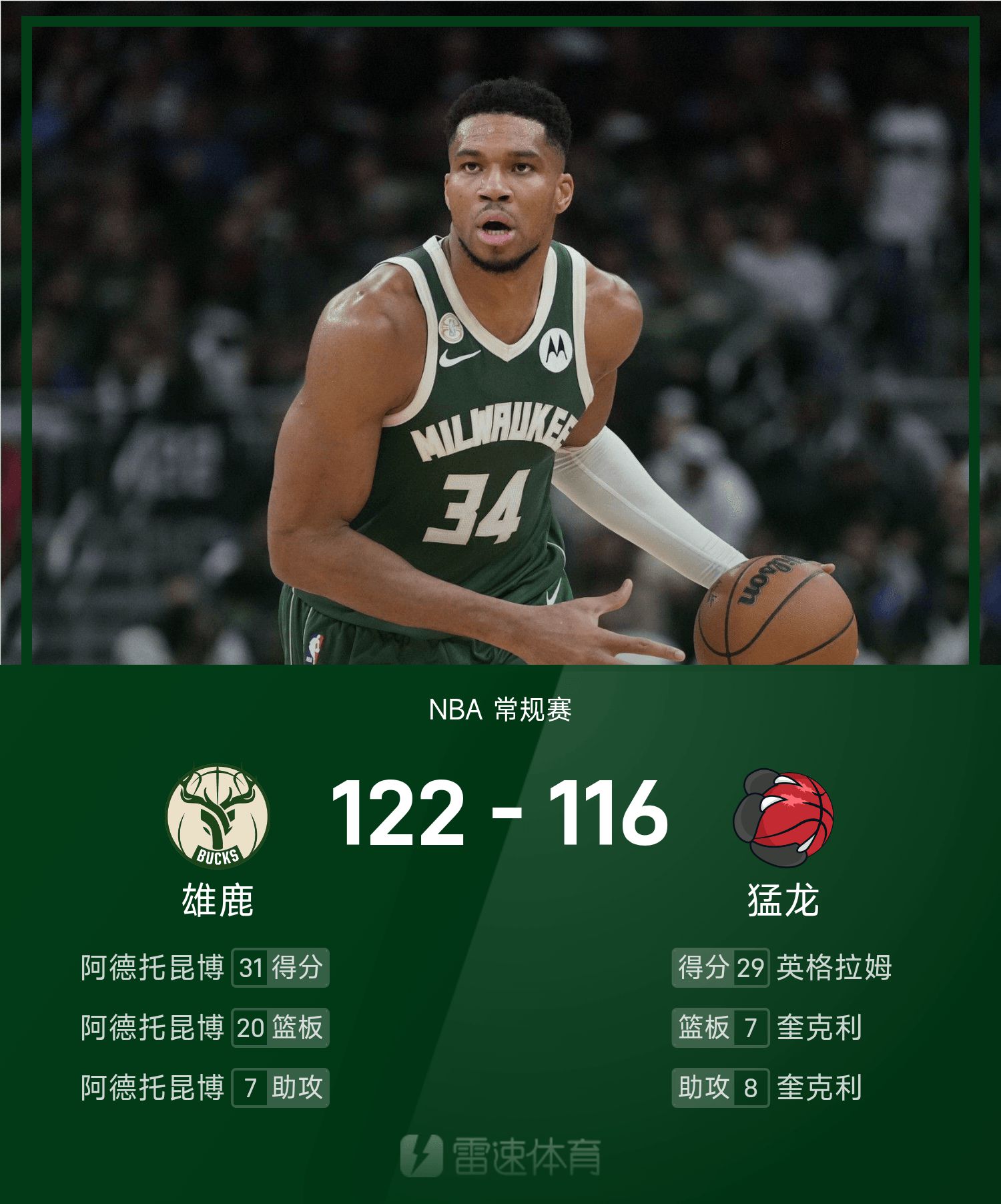 Báo cáo NBA: Antetokounmpo 31 điểm, 20 rebound và 7 kiến tạo, Bucks đánh bại Raptors 122-116
