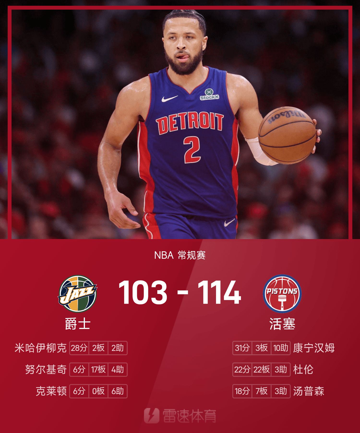 6686 Thể thao Tin tức ngày 06 tháng 11 Trong mùa giải NBA thường lệ 25/26, đội Pistons đối đầu với Jazz. Kết thúc trận đấu, Pistons đánh bại Jazz với tỷ số 114-103. Cunningham đã ghi được 31 điểm cao nhất trận, 3 rebound và 10 kiến tạo, đưa Pistons đến chiến thắng.